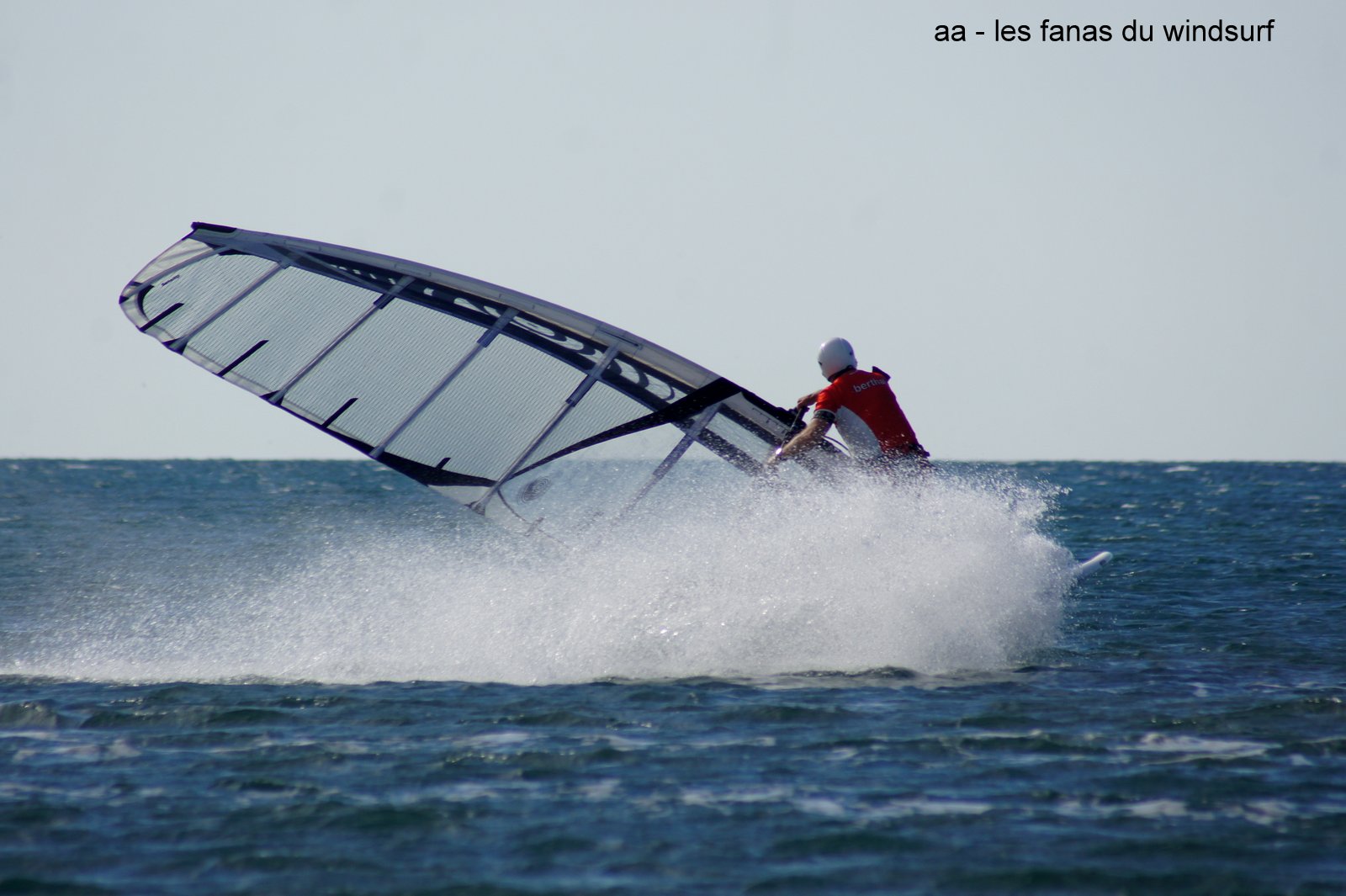 Le point important : attaque du jibe avec la main avant reculée sur le wishbone, ce qui permet de conserver le gréement incliné sur l'avant du flotteur en chargeant la carre et empêche celui-ci de rebondir dans le clapot durant toute la conduite dans la courbe (avec voile bordée et jambes fléchies):